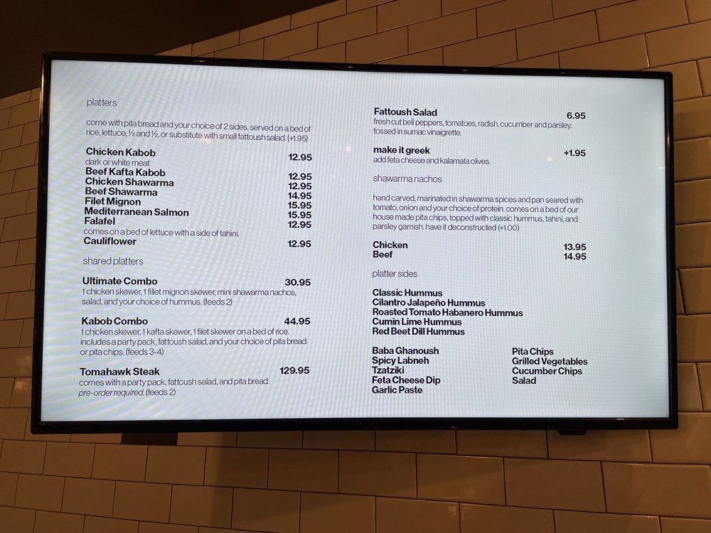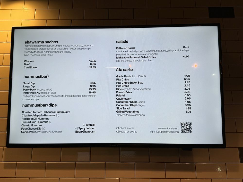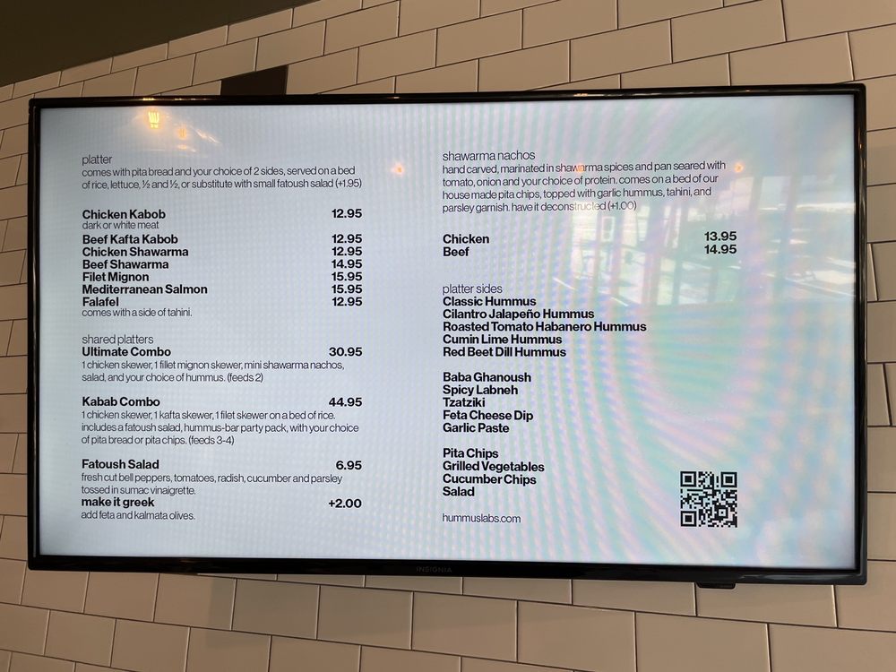 “ My husband and I stopped by on Saturday, Nov 30, 2024 before 12:30 PM. We have tried hummus labs before, but this was my first time at the physical store! We ordered: Special - Chicken Kabob Platter $11.95 - This is a good deal. The chicken was perfectly cooked, moist, and not dry at all. It was quite flavorful. I enjoyed their hummus - leans slightly on the salty. The salad was decent - I would choose another side next time. Shwarma Beef Nachos $17.95 - Delicious but also salty. They are a little pricier but give you plenty of meat on top of pita chips. This dish was a little too salty for my liking, but it was still yummy. Seating: Indoor seating is available! Customer Service: It was good! The lady who helped us was warm, friendly, and courteous! Overall, a great experience, and we would come back! ”